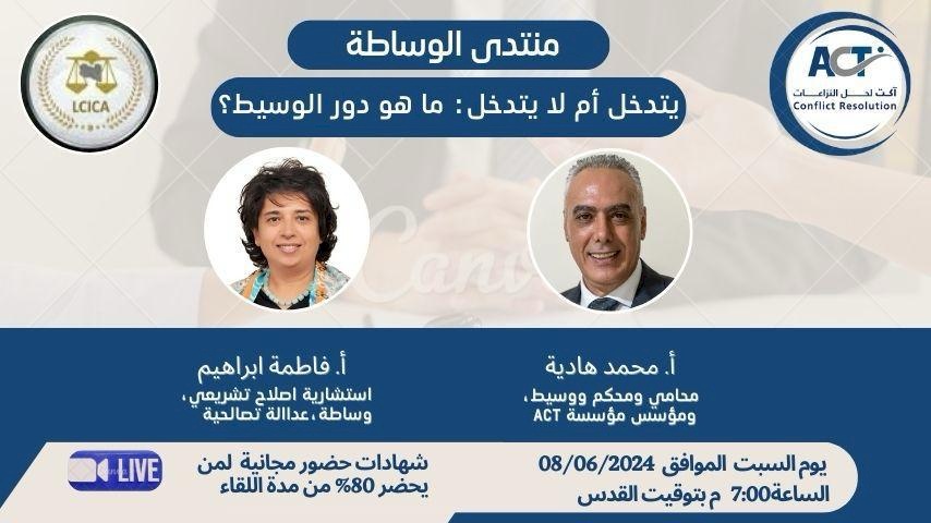 تتشرف مؤسسة آكت لحل النزاعات وبالتعاون مع المركز الليبي للتحكيم التجاري الدولي بدعوتكم لحضور جلسة حوارية جديدة من منتدى الوساطة تحت عنوان "يتدخل أم لا يتدخل: ما هو دور الوسيط؟"