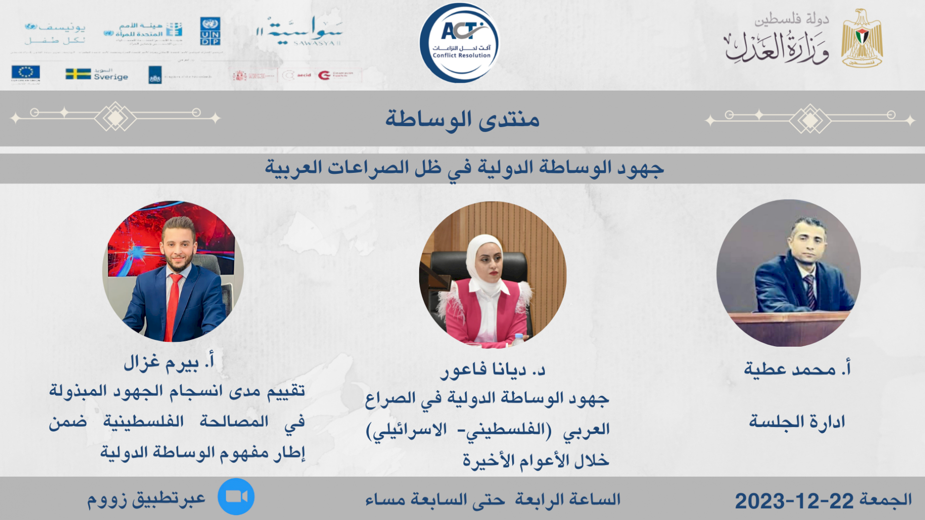 عقدت مؤسسة ACT لحل النزاعات جلسة حوارية حول موضوع جهود الوساطة الدولية في ظل الصراعات العربية من خلال منتدى الوساطة ضمن مشروع تعزيز دور الوسائل البديلة لحل النزاعات في القدس بالتعاون مع وزارة العدل وبدعم من برنامج سواسية وذلك بتاريخ 22/12/2023