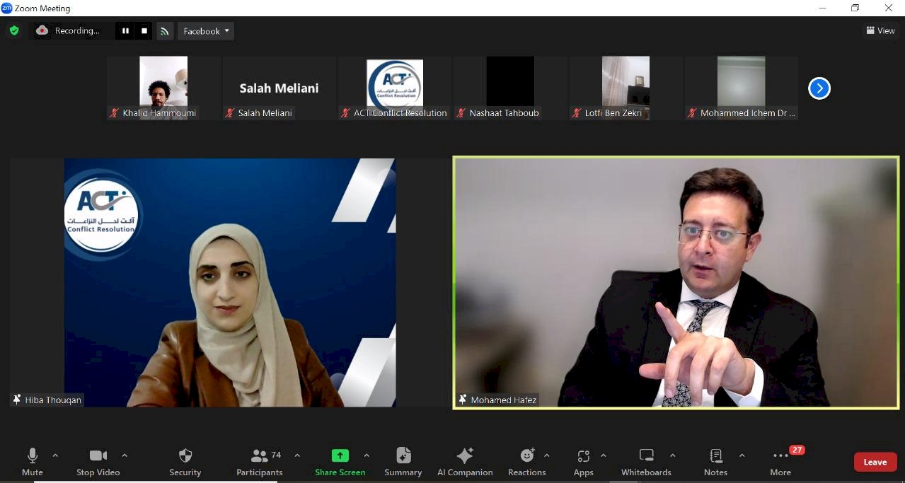 وقد استضافت مؤسسة ACT من خلال منتدى التحكيم ولمدة ساعة ونصف الدكتور محمد حافظ مساعد مدير المركز للشئون القانونية وتطوير اعمال مركز القاهرة الإقليمي للتحكيم التجاري الدولي ، وذلك في جلسة حوارية معدة من قبل الأستاذة هبه ذوقان وهي محامية ومحكم في منازعات العقود المدنية والتجارية من فلسطين بحضور 80 مشارك ومشاركة من مختلف الدول العربية.